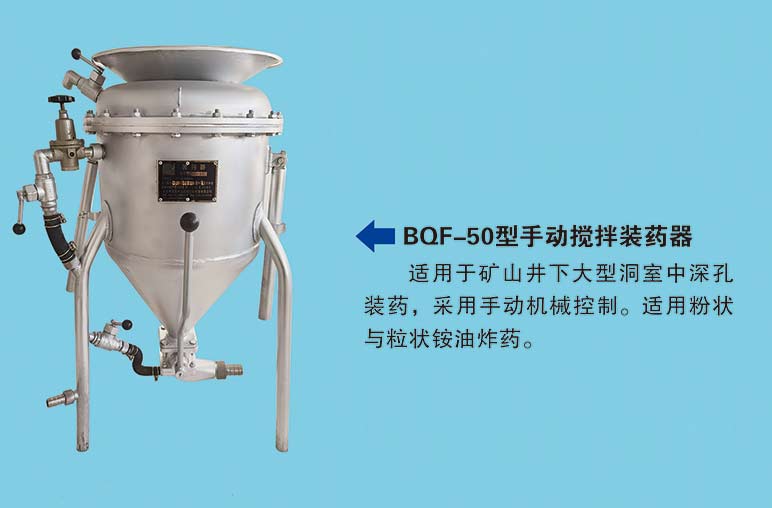 BQF-50 型抬杠式有攪拌裝藥器,適用于礦山井下大型洞室中深孔裝藥,采用手動機(jī)械控制。適用粉狀與粒狀銨 *油 *炸* 藥。